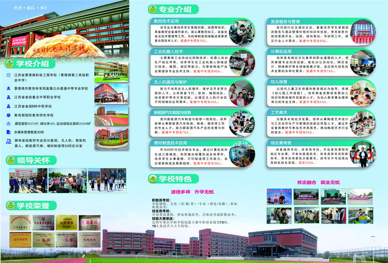 学校坚持以立德树人为根本、以适应职业需求为导向,以提高实践能力为重点,深化校企合作、产教融合,努力培养高素质技术技能人才,为景德镇市经济发展提供智力支持和人才保障。开设了数控技术应用、增材制造技术应用、工业机器人技术应用、无人机操控与维护、旅游服务与管理、幼儿保育、新能源汽车制造与检测、计算机应用、工艺美术、音乐表演等10个专业,并开办了综合高考班以及中高职一体化长学制大专班(3+2)等。