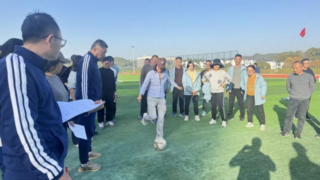 教师趣味赛场同样热闹非凡,无敌风火轮、背靠背夹球、足球点球大赛三个项目趣味盎然,老师们暂时卸下讲台的严谨,或协同推进“风火轮”奋勇向前,或默契配合夹球疾行,或瞄准球门精准射门,欢声笑语中展现了别样的活力风采。